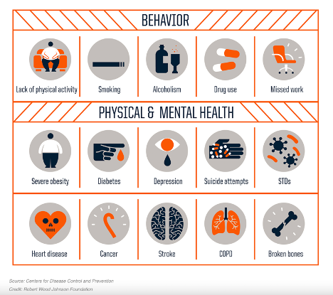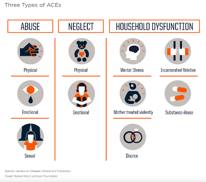 Adverse Childhood Experiences are potentially traumatic events that occur in childhood. ACEs can include violence, abuse, and growing up in a family with mental health or substance use conditions. Toxic stress from ACEs can change brain development and affect how the body responds to stress. ACEs are linked to chronic health problems, mental illness, and substance misuse in adulthood1. ACEs are ten subgroups divided into three categories.